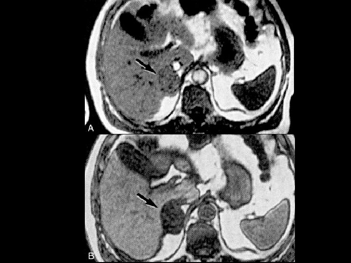 Adrenal adenoma • Findings: – Large right adrenal lesion – Isointense to liver on in -phase scan – Hypointense to liver (signal loss) on out-ofphase scan • ddx: – NONE! – This is an Aunt Minnie!
