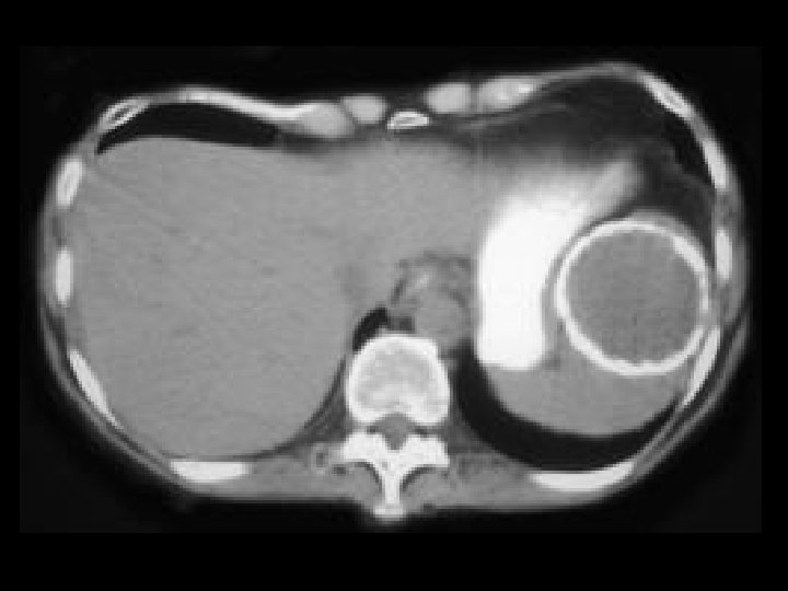 Calcified splenic cyst • Findings: – Large low density splenic lesion – Thick calcified wall • ddx: – Posttraumatic (false) – Epidermoid (true) – Chronic hydatid disease