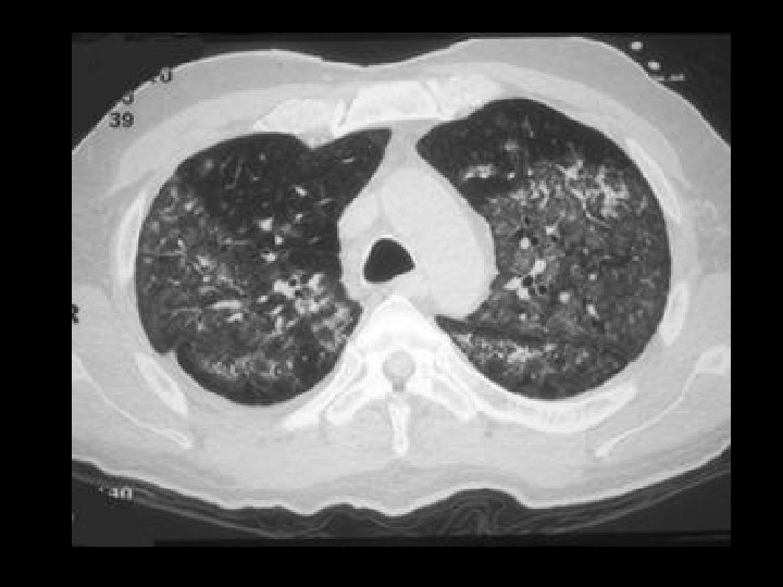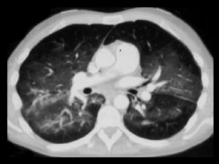 Pneumacystis pneumonia • Findings: – Bilateral ground glass opacity emanating from the hila – Normal underlying parenchyma • ddx: – Hypersensitivity pneumonitis – Usual interstitial pneumonia – Cryptogenic organizing pneumonia – Hemorrhage