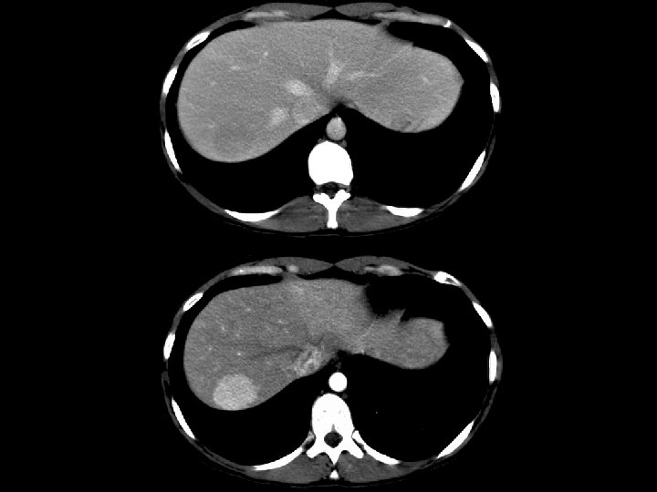 Focal nodular hyperplasia • Findings: – Intensely enhancing lesion in the hepatic dome in the arterial phase – Quick washout in the portal-venous phase • ddx: – Hypervascular tumor – Metastasis