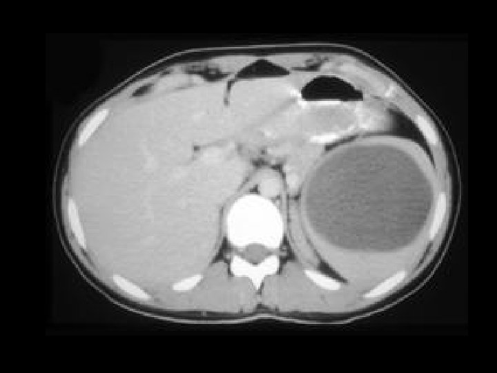 Non-calcified splenic cyst • Findings: – Large homogeneous low density splenic lesion – No calcified wall • ddx: – Epidermoid cyst (true) – Pancreatic pseudocyst – Hydatid disease – Abscess
