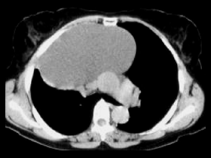 Thymic cyst • Findings: – Large cystic mass in the anterior mediastinum – High attenuation along the periphery = calcification or rim enhancement • ddx: – Cystic teratoma