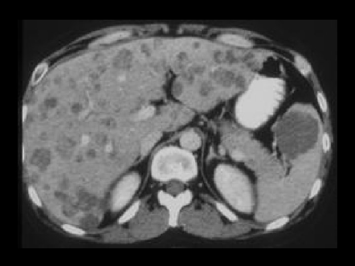 Lymphoma • Findings: – Innumerable low density lesions of the liver and one in the spleen • ddx: – Metastatic disease – Fungal abscesses