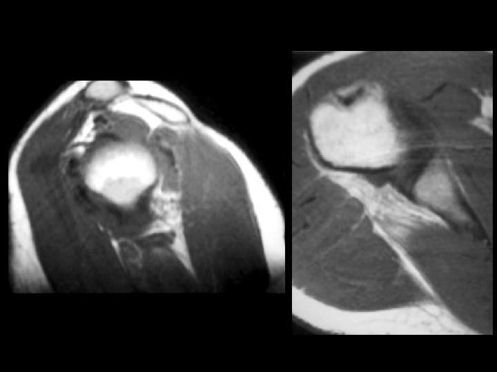 Atrophy of the teres minor • Findings: – High T 1 signal at the attachment of the teres minor = fatty muscular atrophy – Axillary nerve impingement in the quadralateral space • ddx: – NONE! – This is an Aunt Minnie! S I S T
