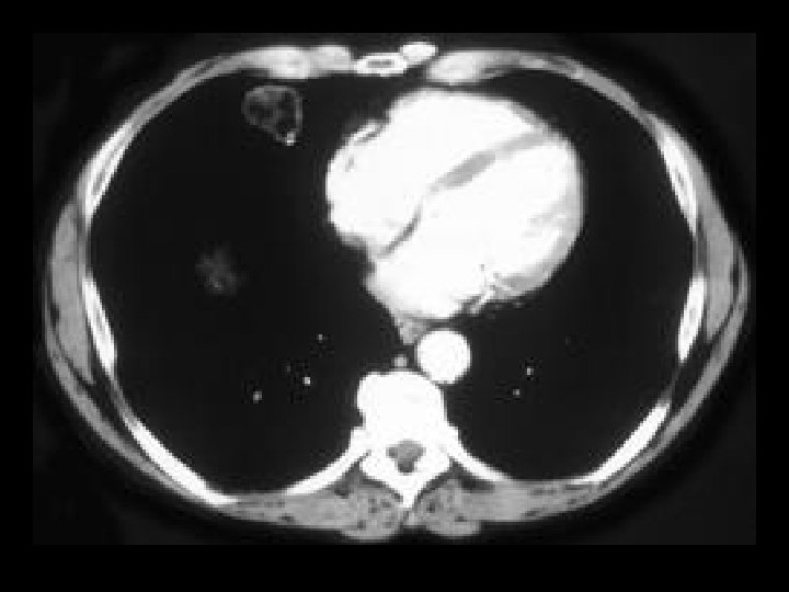 Pulmonary hamartoma • Findings: – Solitary pulmonary fatcontaining nodule in the RML – May exhibit “popcorn” calcification • ddx: – NONE! – This is an Aunt Minnie!