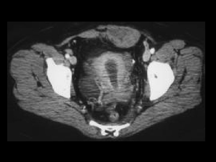 Ovarian cystadenocarcinoma • Findings: – Large multilocular cystic lesion with fine septa in the right hemipelvis • ddx: – Ovarian cystadenoma – Tubo-ovarian abscess – Mucocele of the appendix