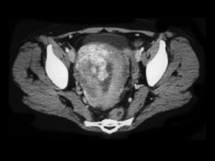 Endometrial carcinoma • Findings: – Irregular enhancing mass extending from the endomentrial cavity to the myometrium • ddx: – Leiomyosarcoma – Metastasis – Gestational trophoblastic disease (if pt pregnant)