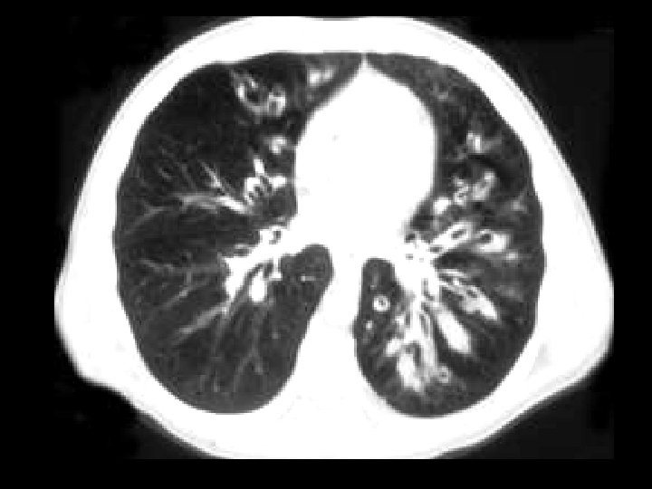 Diffuse bronchiectasis • Findings: – Thick-walled tubular structures extending from the hila to the periphery – Accompanying pulmonary artery = “signet ring” sign • ddx: – Immotile ciliary syndrome – Chronic infections (immune deficiency)