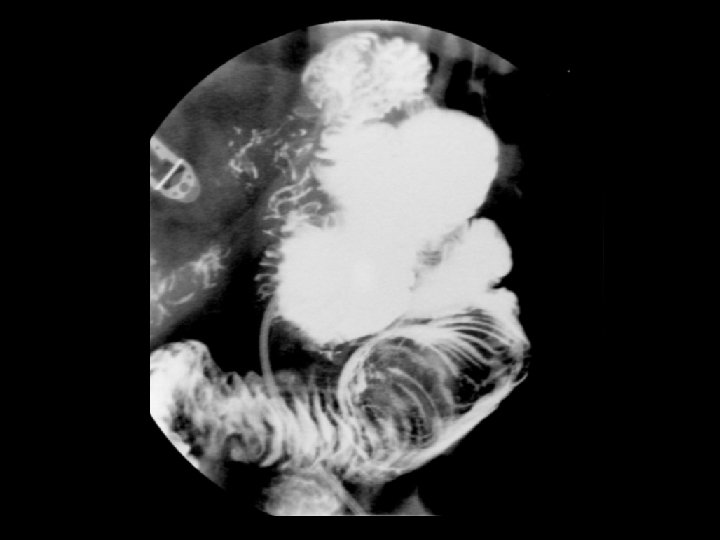 Achalasia • Findings: – Dilated and debrisfilled esophagus • ddx: – Pseudoachalasia • Obstructing tumor • Benign or malignant stricture • Chaga’s disease – Posterior mediastinal abscess