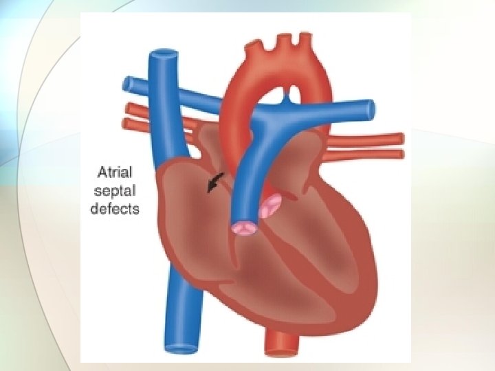 Atrial Septal Defect • 6 -10% of all births (1 of 1500 live births) • 2 times more common in females than males. • Types: • Ostium Secundum (at or about the Foramen Ovale) • Sinus Venous (at about the point where SVC and IVC attach to Right Atrium) • In 1950 most children with ASD did not reach the first grade. Today, first year surgery facilitates normal growth and development.