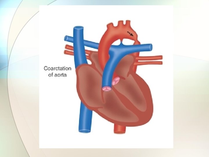 Coarctation of the Aorta • 7% of congenital cardiac defects. • Constriction of the aorta. • Results in severely reduced blood flow. • Increased work on the heart leading to CHF and cardiovascular collapse. • Location of narrowing determines the clinical signs. • Usually associated with PDA, VSD and a defective aortic valve.
