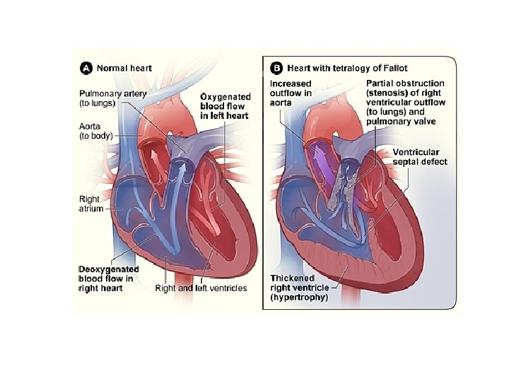 Clinical features: -Children may present with dyspnoea or fatigue or with hypoxic episodes (Fallot’s spells), i. e. deep cyanosis and possible syncope on exertion, squatting is common. -Systolic ejection murmur at the second left intercostal space close to the sternum. -Central cyanosis -Clubbing of fingers and polycythemia are abvious after about 1 yr -Growth retardation.
