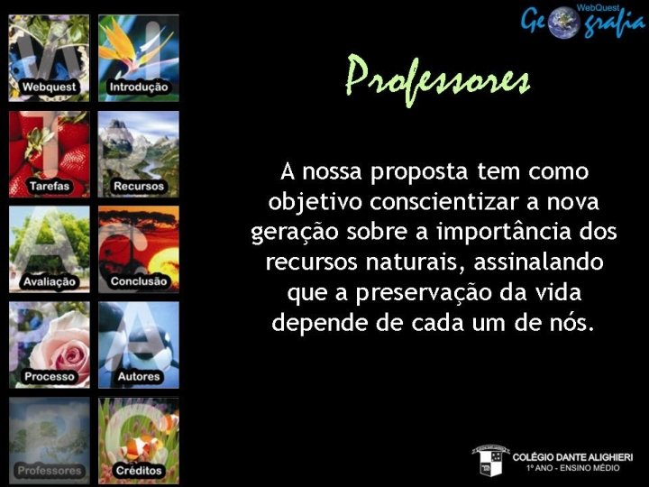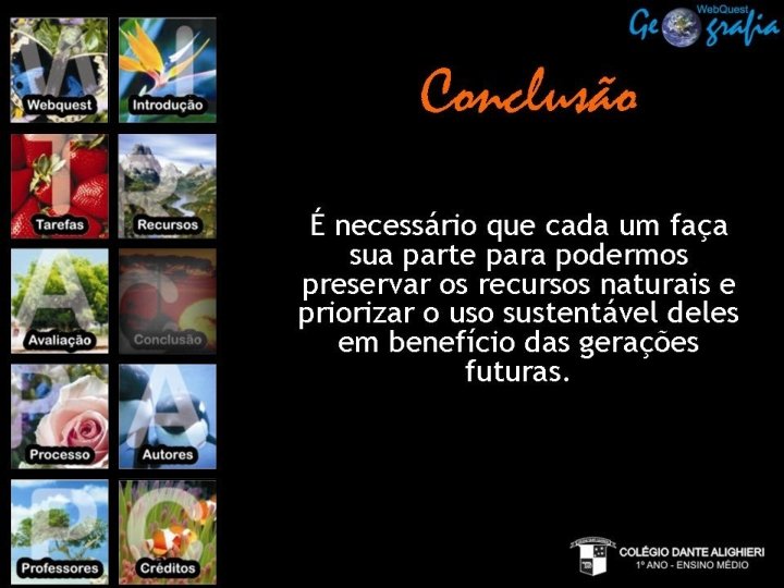 1 - O nosso objetivo é conquistar pessoas para juntos salvarmos o nosso planeta. Entreviste 5 pessoas para conhecer como cada uma contribui para um mundo melhor, procurando saber sua postura em relação aos temas abordados nesta Web. Quest, e também se praticam outras ações que visam à preservação do meio ambiente. Escolher, entre as entrevistas, as respostas mais significativas e elaborar cartazes com ilustrações, nome dos entrevistados, idade, profissão e a ação que essa pessoa já faz, convidando todos a seguirem esse exemplo. “Os caminhos para um amanhã melhor para nós e nossos filhos. ” Para elaboração do cartaz, utilizar RECURSOS de computador (o grupo elege o programa para fazer o cartaz), o tamanho da página deve ser A 4 (tamanho de uma folha sulfite). Os melhores cartazes de cada classe serão utilizados como decoração no VII D@nte Digit@l.