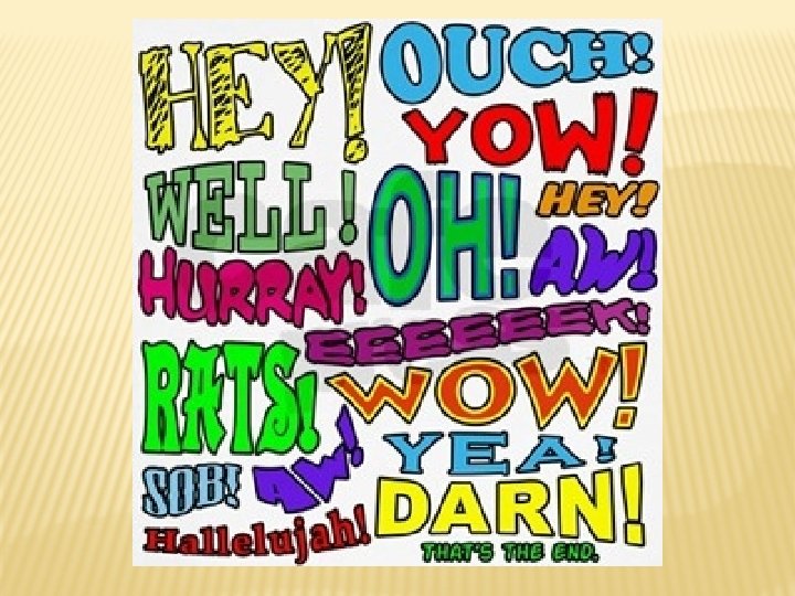 � Conventions like Hi, Bye and Goodbye are interjections, as are exclamations like Cheers! and Hooray!. In fact, like a noun or a pronoun, they are very often characterized by exclamation marks depending on the stress of the attitude or the force of the emotion they are expressing. Well (a short form of "that is well") can also be used as an interjection: "Well! That's great!" or "Well, don't worry. " Much profanitytakes the form of interjections. Some linguists consider the pro-sentences yes, no, amen and okay as interjections, since they have no syntactical connection with other words and rather work as sentences themselves. Expressions such as "Excuse me!", "Sorry!", "No thank you!", "Oh dear!", "Hey that's mine!", and similar ones often serve as interjections. Interjections can be phrases or even sentences, as well as words, such as "Oh!" "Pooh!" "Wow!" or "sup!".