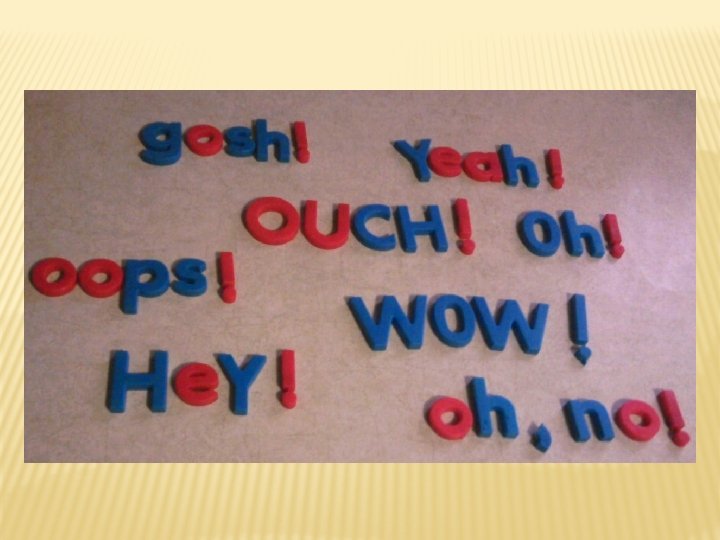 INTERJECTIONS � are words or phrases used to exclaim or protest or command. They sometimes stand by themselves, but they are often contained within larger structures.