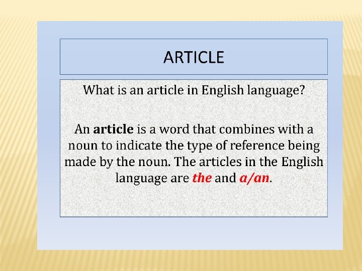 � An article (abbreviated ART) is a word (or prefix or suffix) that is used with a noun to indicate the type of reference being made by the noun. Articles specify grammatical definiteness of the noun, in some languages extending to volume or numerical scope. The articles in the English language are the and a/an, and (in some contexts) some. 'An' and 'a' are modern forms of the Old English 'an', which in Anglian dialects was the number 'one' (compare 'on', in Saxon dialects) and survived into Modern Scots as the number 'ane'. Both 'on' (respelled 'one' by the Normans) and 'an' survived into Modern English, with 'one' used as the number and 'an' ('a', before nouns that begin with a consonant sound) as an indefinite article.