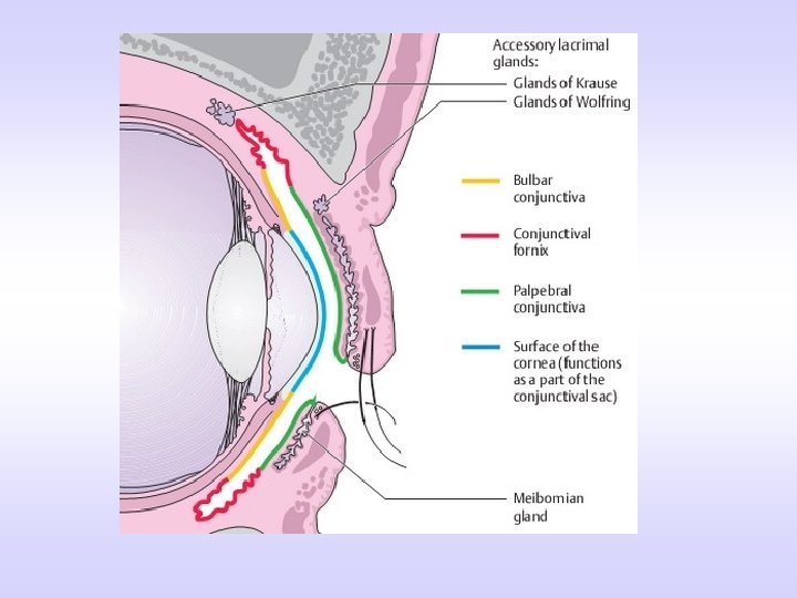Function of the conjunctiva • The conjunctiva : 1) helps lubricate the eye by producing mucous and tears. 2) contributes to immune surveillance. 3) helps to prevent the entrance of microbes into the eye.