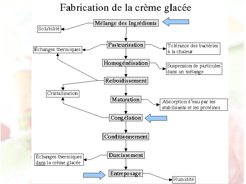 Qualité : normes et règlementation Echelle Européenne Code Euroglace (actualisé 2008) (industriels européens, définit les appellations. ) Système HACCP (Codex Alimentarius (de l’OMS). ) Code des pratiques loyales des glaces alimentaires (2008 ) Par le SFIG et la Confédération Nationale des Glaciers de France Définit les compositions et les dénominations de vente des différentes catégories de glaces en France. Règlement CE n° 2073/2005 Microbiologie