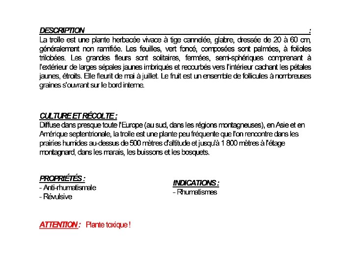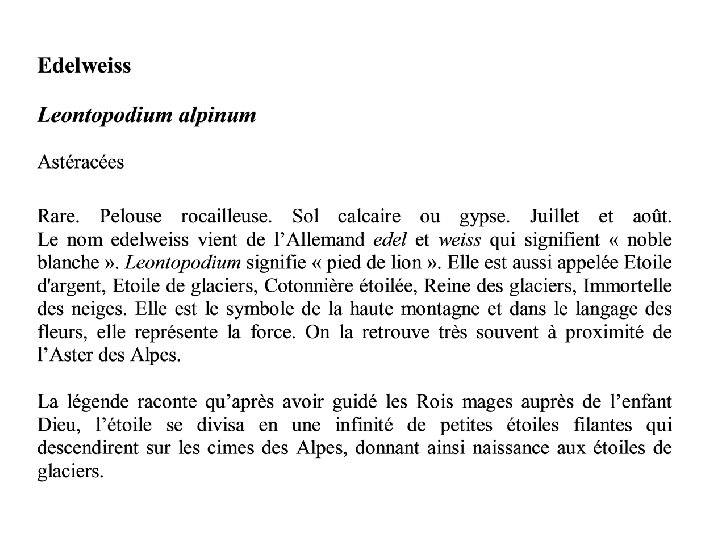 Ancolie Lupin Anémone Lys martagon Bleuet Marguerite Bouton d’or Mimosa Camélia Muguet Chardon Mélèze Coquelicot Narcisse Crocus Nénuphar Dahlia Oeillet Digitale Orchidée Edelweiss Passiflore Fraisier Pensée Gentiane Pin Génépi Pissenlit Géranium Rose Iris Trolle Jacinthe Tulipe Lavande Violette