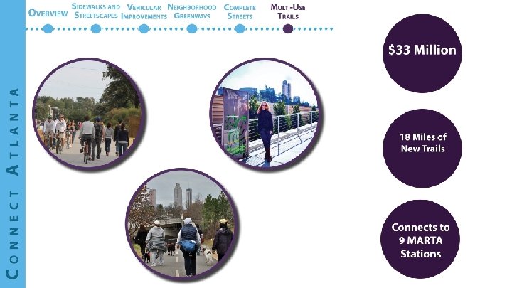 Connect Atlanta – Multi-Use Trails • $33 M • 18 miles of new multi-use trail including PATH 400, Lionel Hampton Trail extensions, De. Kalb Ave, and Proctor Creek Greenway • Builds on the existing trail network and Atlanta Belt. Line extensions • Includes trail connections to 9 MARTA Stations