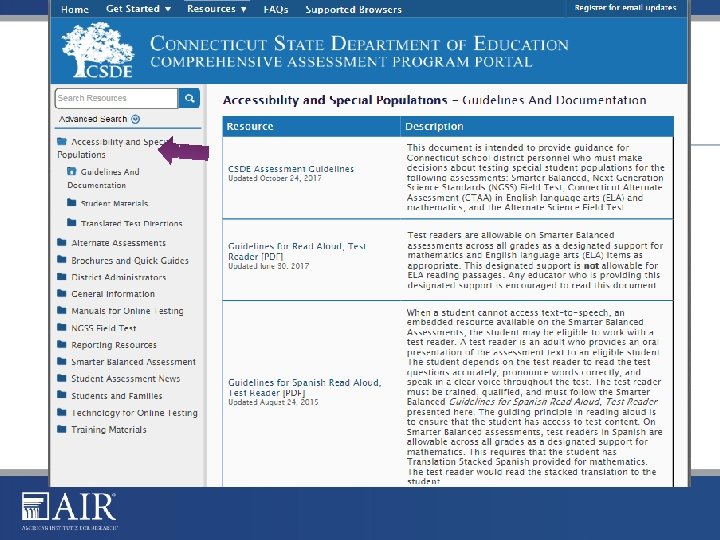 Special Populations Resources- Documents-Links Description This document is intended to provide guidance for Connecticut school district personnel who must make decisions about testing special student populations on Smarter Balanced, Connecticut NGSS (Standard) Science, Connecticut Alternate Assessments and Connecticut NGSS (Alternate) Science. Power. Point presentation on the usability features available for students who will be taking the Smarter Balanced Assessments and Science. This includes a deeper understanding of the tools, designated supports and accommodations available to a variety of students. This form is intended for Special Education, 504 and EL students taking the Smarter Balanced Test and Connecticut Alternate Science to indicate designated supports, and accommodations. This information is submitted on TIDE. The Text-to-Speech and Read Aloud Decision Guidelines 2017 -2018 Form must be completed for any student in Grades 3 -8 who will receive the accommodation of Text-to-Speech or Read Aloud of English language arts/literacy (ELA) reading passages on the Smarter Balanced assessments. This completed form should be submitted electronically to the CSDE. The Text-to-Speech and Read Aloud Decision Guidelines 2017 -2018 provides guiding questions about determining if a student qualifies to receive this accommodation.
