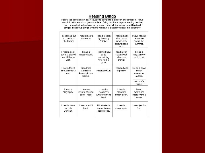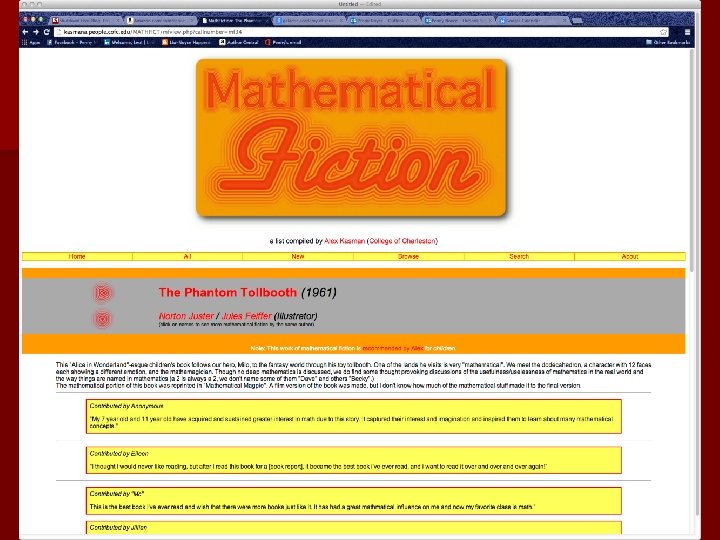 Other Resources Mathical awards from MSRI and CBC http: //mathicalbooks. org/portfolio/prize-winners/ Mathematical Fiction: Searchable lists and reviews. http: //Kasmana. people. cofc. edu/MATHFICT For finding the math in middle school literature: https: //www. chatham. edu/pti/curriculum/units/2 009/Lo. Albo. pdf
