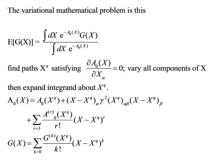 Variational principles. Laplace’s method (1774): Find Xq which satisfy variation “saddle path” via unconstrained Expand integral around the Xq to approximate the integral. Finding the Xq is called 4 DVar in geosciences. In the context of the path integral, this has a precise form, and one can evaluate corrections to the Laplace approximation.