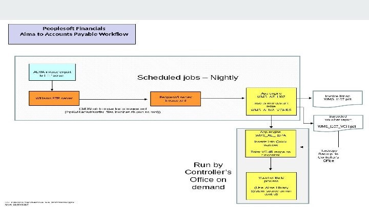Financial Nightly output to accounts payable. Majority of our invoices are EDI - YBP self checkout, EBSCO, Wiley, etc Output to sftp server and a cron job triggers a copy to a second server, a program in Peoplesoft then pulls the file from that second server into people soft for processing. Issues We have not been able to get payment information imported back into the system - the identifier does not travel We still need to send over paper versions of the vouchers