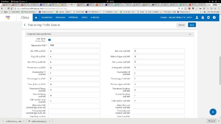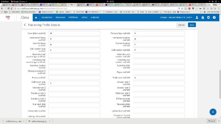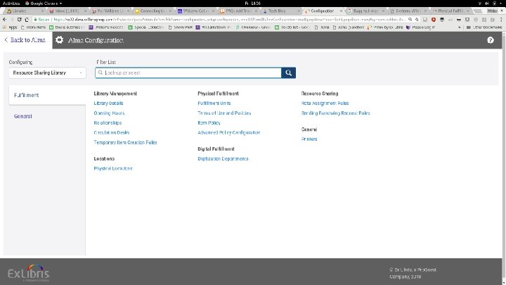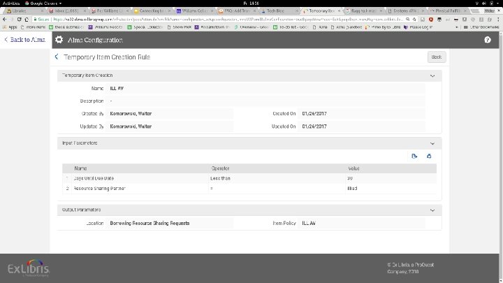 What we achieved Alma ● Patron and staff authentication via Shibboleth using Williams login ○ ● ● ● Now use for everything including ILLiad Patron data updated nightly - students; faculty; staff; others Nightly output to Financial office (Accounts Payable) Nightly output of fines and credits to Bursar Office Holdings (symbol) set in nightly jobs for OCLC; export and ftp of original cataloging Update of Elsevier and Ovid holdings weekly (E-book Central also possible) ILLiad integration with fulfillment for borrowed items