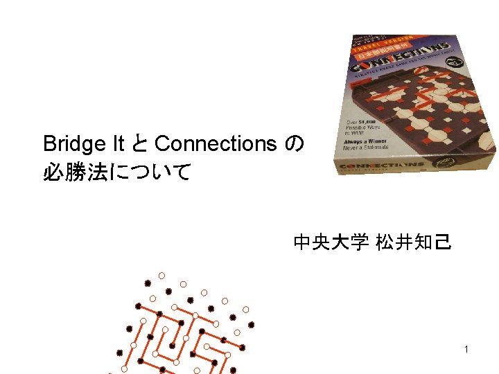 Connections は先手の必勝戦略がある (strategy stealing) 前出のpairing 戦略は 先手必勝ではない Our Result Lehman’ Theorem を用いた明示的な 先手の必勝戦略 A. Lehman, A solution to the Shannon switching game, SIAM J. Appl. Math. , 12 (1964), 687-725. 9