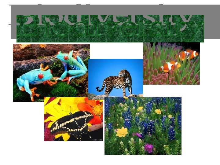A. Biodiversity (biological diversity) means different kinds of life. 1. Genetic diversity – the variability in genetic make up within a population 2. Species diversity – the variety of species on earth 3. Ecological diversity – all the different types of biological communities on earth. Ex. Wetlands, forests, estuaries.
