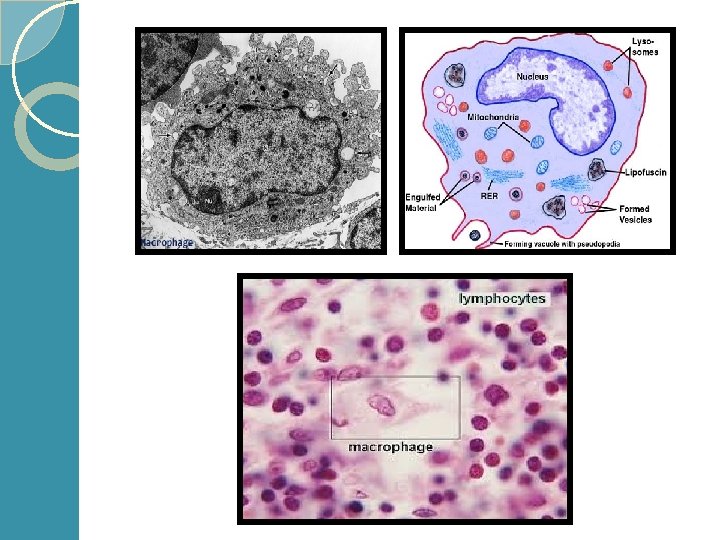 Macrophage (MPS) Origin: BM monocyte ( in blood) Macrophage in C. T. v Irregular membrane surface; nucleus may be oval and is eccentric v Size: 10 -30 micro v Phagocytosis of cell debris and micro organisms v Presenting antigens to lymphocytes v RBC turnover in spleen v Secretion of cytokins, enzyme v In chronic inflammation form Epitheloid cells or multinuclear giant cells v
