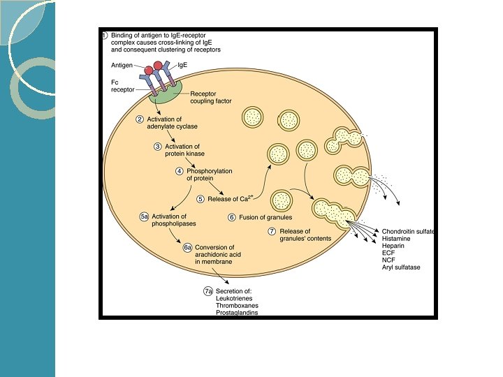Mast cell Cytoplasm full of granules containing heparin, histamine, proteases, chemotactic factors, chondroitin sulphate � Size: 10 -13 micro � Centeric nucleus � Originate from bone marrow stem cell �