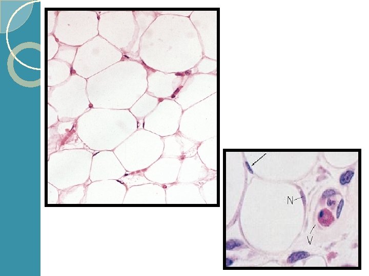 Two Types of Adipose Tissue q. Yellow, White or unilocular àcells with one large fat droplet in cytoplasm q. Brown or multilocular àcells with numerous smaller lipid droplets in cytoplasm and many mitochondria
