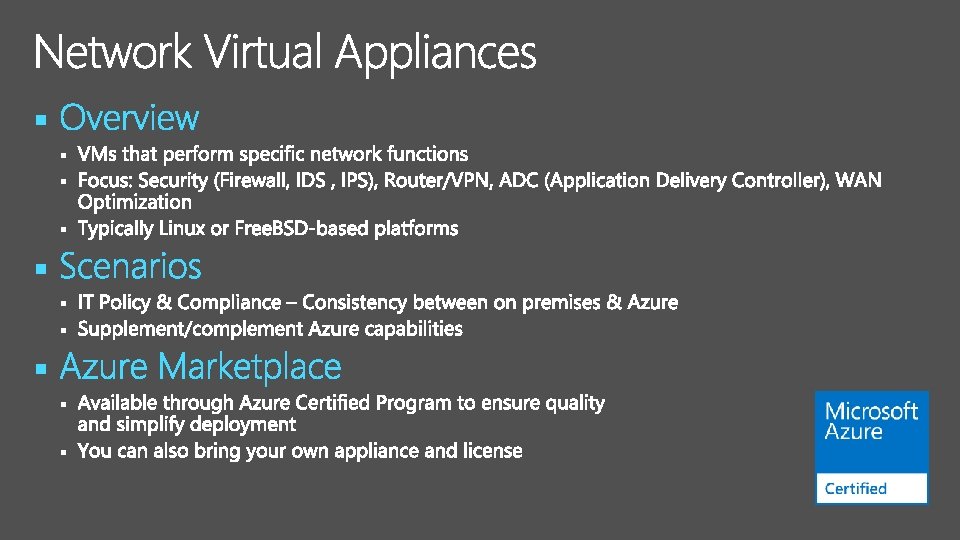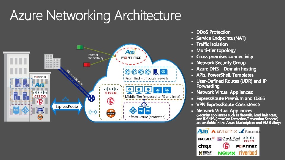 On Premises 10. 0/16 § Internet § § Express. Route and VPNs √ √ § √ VPN GW Azure VNet Backend 10. 3/16 √ Mid-tier 10. 2/16 Frontend 10. 1/16
