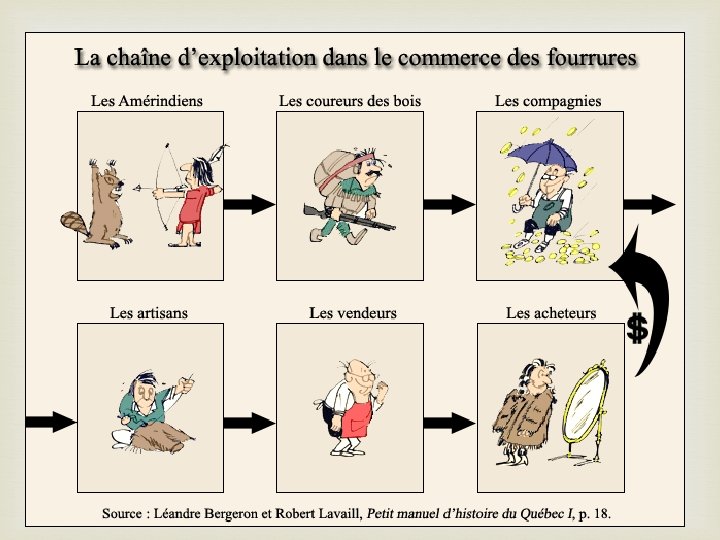 Le commerce des fourrures et ses conséquences sur la colonie Commerce des fourrures (castor, chapeaux de feutre) France accorde à des compagnie de fourrure le monopole du commerce des fourrures Alliances amérindiennes Commerce en 1660: difficulté 1663: Gouvernement royal prend le contrôle Les Français construisent des forts et des postes de traites. 1690: Crise du Castor, baisse des prix. La fourrure représente 70% des exportations.