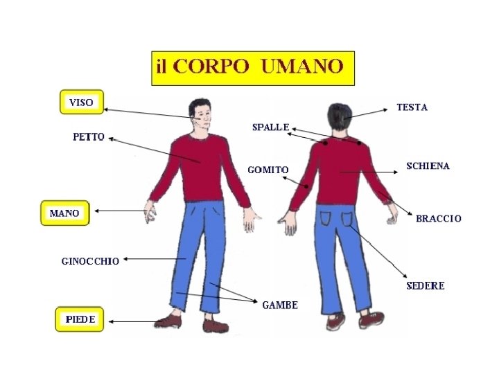 Le parti del corpo umano: Il corpo umano è composto da 3 parti: CAPO - TRONCO-ARTI. Il capo è costituito dalla parte alta, e va dalla cima dei capelli al collo. Il tronco o torace è formato dalla parte centrale, inizia dal collo e termina all’inguine. Gli arti sono le estremità, cioè le braccia e le gambe.