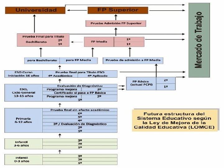FORMACIÓN PROFESIONAL n n La Formación Profesional Básica La Formación Profesional específica se organiza en Ciclos Formativos de Grado Medio y Grado Superior proporcionando enseñanzas profesionales regladas que dan acceso a titulaciones académicas. n Los Ciclos Formativos se organizan en Familias Profesionales, pero cada uno de ellos tiene unos contenidos específicos. n Existen dos modalidades de oferta formativa: presencial y a distancia. n Paralelamente existe una amplia oferta de Formación Profesional Continua y Formación Profesional Ocupacional cuyo objetivo es proporcionar capacitación laboral a personas desempleadas o que desean mejorar su formación. La acreditación no tiene valor académico, aunque sí goza de reconocimiento en el mundo laboral.