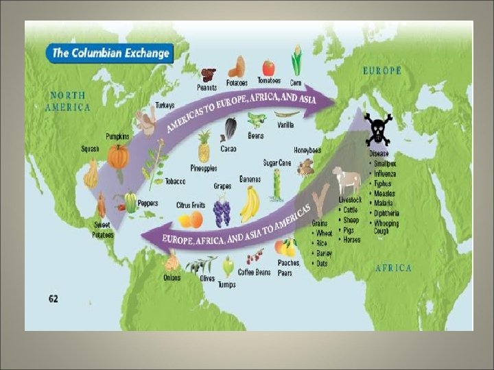 The Columbian Exchange – Biosocial changes to New World and Europe – Flora, fauna, and disease traveled in both directions across the Atlantic – New World foods (like potatoes) became Old World staples – Domestic animals (like horses) were brought to the new world – European diseases ravaged Amerindian populations – Sailors and settlers brought syphilis back with them to Europe