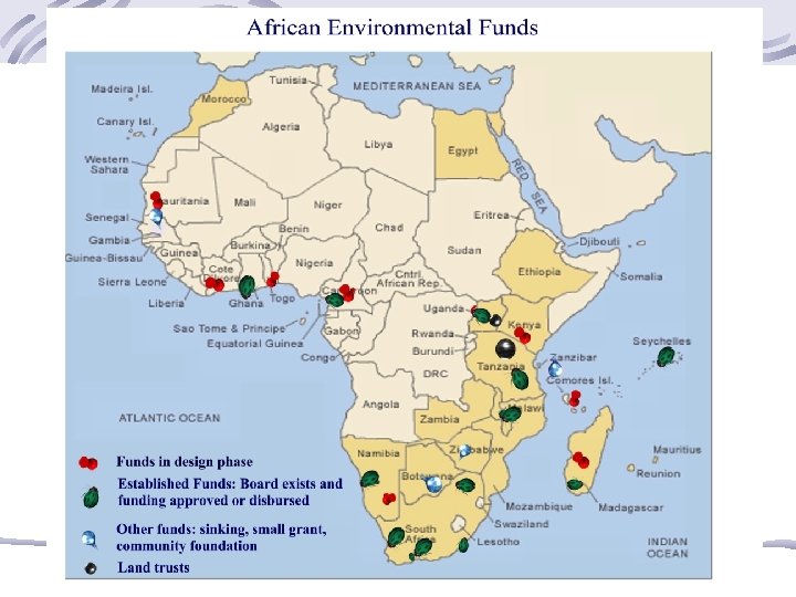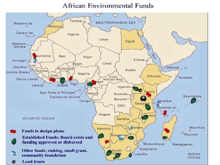 Legal Eastern and Southern Africa law facilitates the formation of trusts and endowments. Straightforward legal process. Gaining in-country tax-free status is a challenge in most countries West African law does not easily support the formation of environmental funds (law of associations) In Cote D’Ivoire PCGAP project with GEF and other donor funding leading the way to modify legislation to address issue – may be a model for other countries.