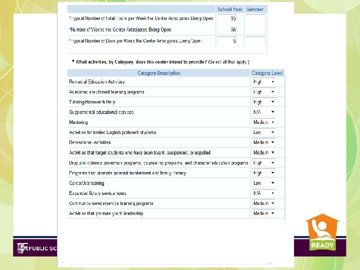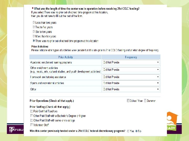 Functions (cont’d) • Each Center/Site is required to report their operating budget on the APR Operations Page • Each Grantee will have TWO Accounts: – (1 -School Year 2 - Summer) With ONE LOGIN • Submitted/Check Data Status Icon