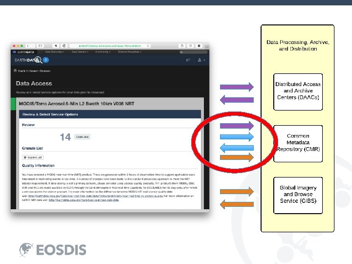 Common Metadata Repository (CMR) • A single source of unified, high-quality, and reliable Earth Science metadata • A high performance ingest and searchitecture for submission and discovery of Earth Observing System Data and Information System (EOSDIS) metadata • A metadata lifecycle that helps evolve metadata standards to ensure ‘richness’ and models with new concepts proposed by stakeholders
