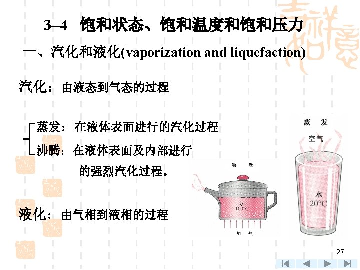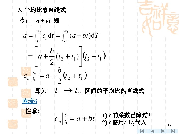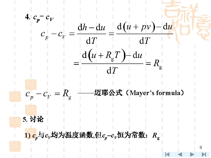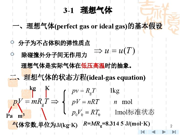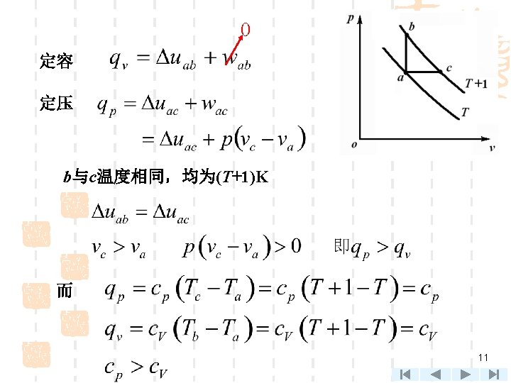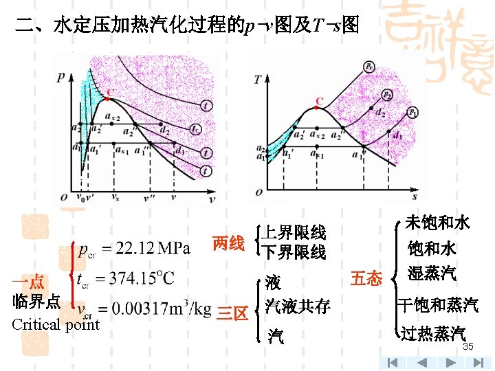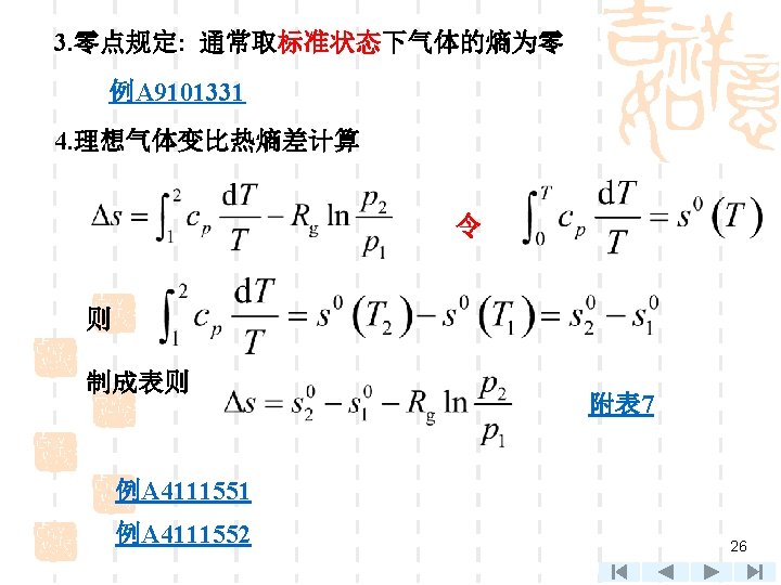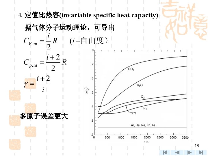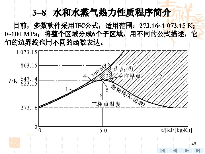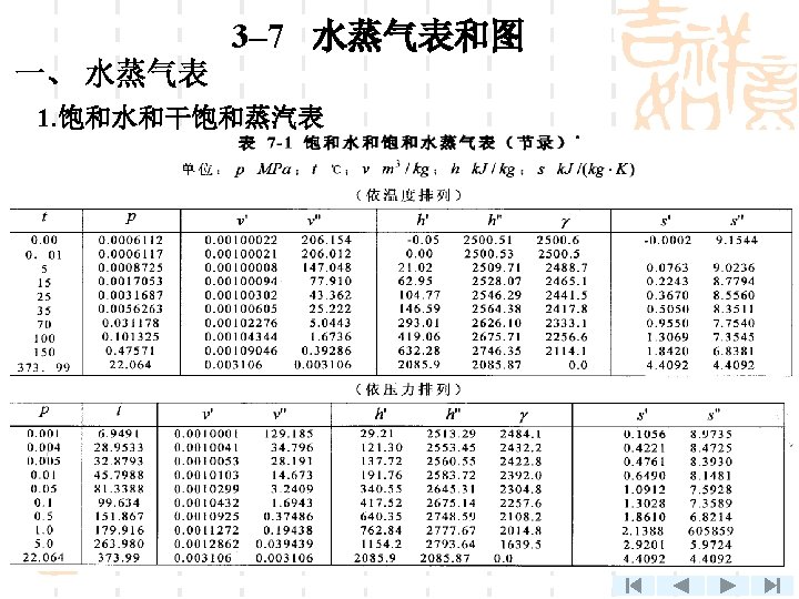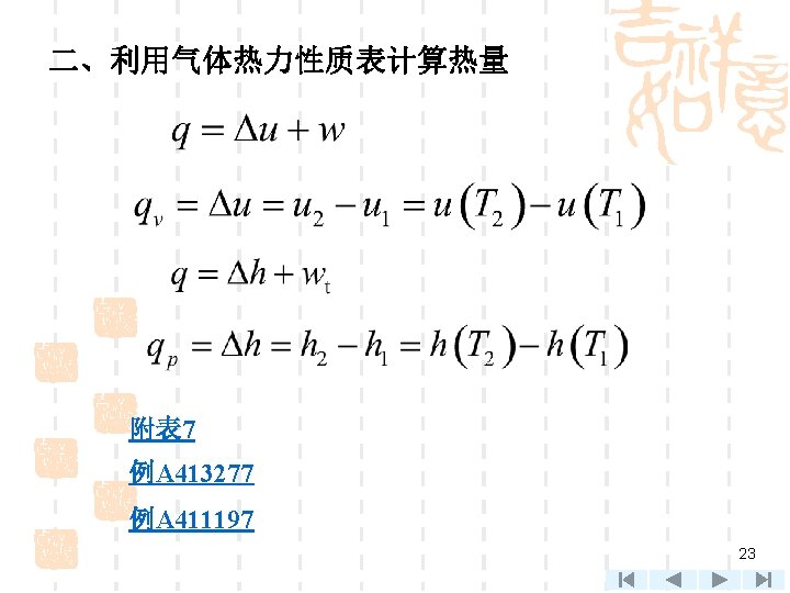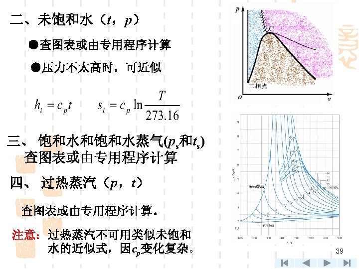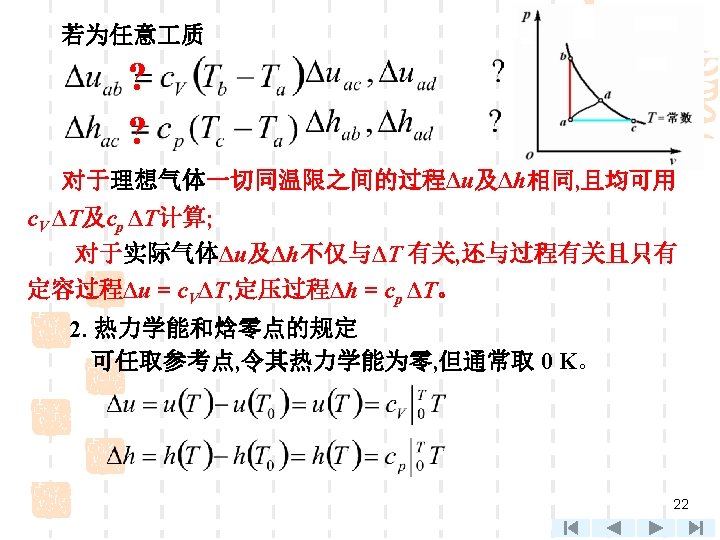 constant pressure specific heat capacity per unit of Slides: 51 Download presentation 按过程 质量定压热容(比定压热容) (constant pressure specific heat capacity per unit of mass) 质量定容热容(比定容热容) (constant volume specific heat capacity per unit of mass) 及 二、理想气体比定压热容,比定容热容和迈耶公式 1. 比热容一般表达式 6 c)气体常数Rg的物理意义 Rg是 1 kg某种理想气体定压升高 1 K对外作的功。 三、理想气体的比热容比 (specific heat ratio;ratio of specific heat capacity) 注:理想气体可逆绝热过程的绝热指数 (adiabatic exponent; isentropic exponent) 例A 902355 12 1. 利用真实比热容(true specific heat capacity)积分 附表 4 2. 利用平均比热容表(mean specific heat capacity) T 1, T 2均为变量, 制表太繁复 =面积amoda-面积bnodb 14 t/ ℃ p/ MPa 0 006 112 20 50 100 0. 0 023 385 0. 0 123 446 0. 1 013 325 120 150 0. 198 483 0. 47 571 29 2. 未饱和水和过热蒸汽表 p 0. 001 MPa 0. 005 MPa 0. 01 MPa � 和 参 数 ts=6. 949 ℃ v’=0. 001 000 1, v”=129. 185 h’=29. 21, h”=2513. 3 s’=0. 105 6, s ”=8. 9735 ts=32. 879 ℃ v’=0. 001 005 3, v”=28. 191 h’=137. 72, h”=2 560. 6 s’=0. 4761, s”=8. 3930 ts=45. 799 ℃ v’=0. 001 010 3, v”=14. 673 h’=191. 76, h”=2583. 7 s’=0. 649 0, s”=8. 1481 t v h s ℃ m 3/kg k. J/kg k. J/(kg· K) m 3/kg k. J/(kg·K ) -0. 0002 0. 0010003 -0. 05 -0. 0002 0. 0010002 42. 01 0. 1510 0. 0010003 42. 01 0. 1510 0 0. 0010002 -0. 05 -0. 04 -0. 0002 10 130. 598 2519. 0 8. 9938 20 135. 226 2537. 7 9. 0588 0. 0010018 83. 87 0. 2963 40 144. 475 2575. 2 9. 1823 28. 854 2574. 0 8. 4366 0. 001009 167. 51 0. 5723 50 149. 096 2593. 9 9. 2412 29. 783 2592. 9 8. 4961 14. 869 2591. 8 8. 1732 60 153. 717 2612. 7 9. 2984 30. 712 2611. 8 8. 5537 15. 336 2610. 8 8. 2313 80 162. 956 2650. 3 9. 4080 32. 566 2649. 7 8. 6639 16. 268 2648. 9 8. 3422 100 172. 192 2688. 0 9. 5120 34. 418 2687. 5 8. 7682 17. 196 2686. 9 8. 4471 120 181. 426 2725. 9 9. 6109 36. 269 2725. 5 8. 8674 18. 124 2725. 1 8. 5466 42 45 例A 122233 例A 8221552 例A 422155 例A 4221661 下一章 51