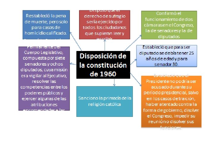 Instauró dos Vicepresidentes, llamados primero y segundo, elegidos conjuntamente con el Presidente de la República Prohibió la reelección presidencial. Respetó las Municipalidades, aunque mencionándolas de manera escueta y dejando su reglamentación a una ley especial Mantuvo el Consejo de Ministros. Disposición de la constitución de 1960 Dejó establecido que los prefectos y subprefectos serían nombrados por el Poder Ejecutivo Para hacer la reforma constitucional solo sería necesario su aprobación en dos legislaturas Estableció claramente la libertad de industrias y ratificó la definitiva supresión de los antiguos gremios.
