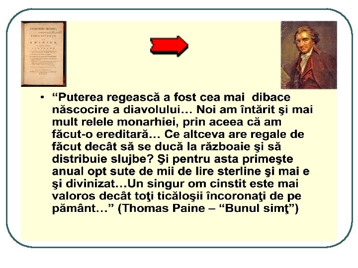 “Considerăm ca adevăruri de la sine înţelese faptul că toţi oamenii s-au născut egali, că sunt înzestraţi de către Creator cu anumite drepturi inalienabile, că printre acestea se numără dreptul la viaţă, la libertate şi căutarea fericirii. Că, pentru a-şi asigura aceste drepturi, oamenii instituie guverne care îşi derivă puterile lor drepte din consimţământul celor guvernaţi. Că, ori de câte ori o formă de guvernare devine primejdioasă pentru aceste ţeluri, este dreptul poporului să o schimbe sau să o abolească şi să instituie o nouă guvernare, întemeind-o pe acele principii şi organizând-o în acele forme de exercitare a prerogativelor sale care I se vor părea cele mai potrivite ca să garanteze siguranţa şi fericirea acestui popor. …Aşadar, Noi, Reprezentanţii Statelor Unite ale Americii, întruniţi în Congres General, făcând apel la Judecătorul Suprem al lumii[…], declarăm şi proclamăm în chip solemn că aceste Colonii Unite sunt şi trebuie să fie de drept state libere şi independente, că sunt absolvite de orice datorie de supunere faţă de Coroana Britanică şi că toate legăturile politice între ele şi Statul Marii Britanii sunt şi trebuie să fie desfăcute în întregime…”. Fragment din Declaraţia de independenţă 4 iulie 1776