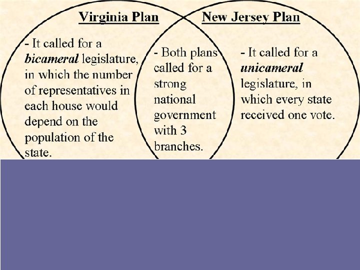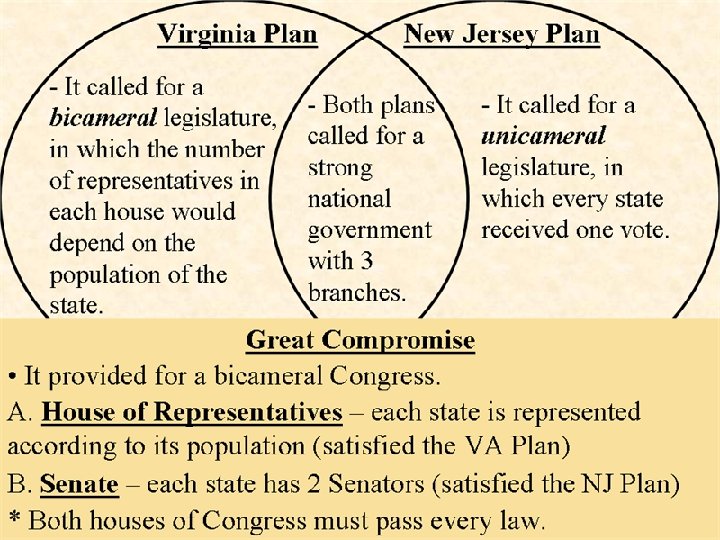 Virginia Plan vs. New Jersey Plan Virginia Plan n Supported by big states n Bicameral (2 houses) n 1 -elected by people, 2 -elected by first house n # of congress determined by population New Jersey n Supported by small states n Unicameral (1 house) n Based on equality n Each state same # of Representatives The Great Compromise § Bicameral (2 house) § House of Representatives determined by population § Senate (each state has 2)