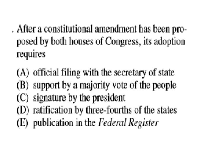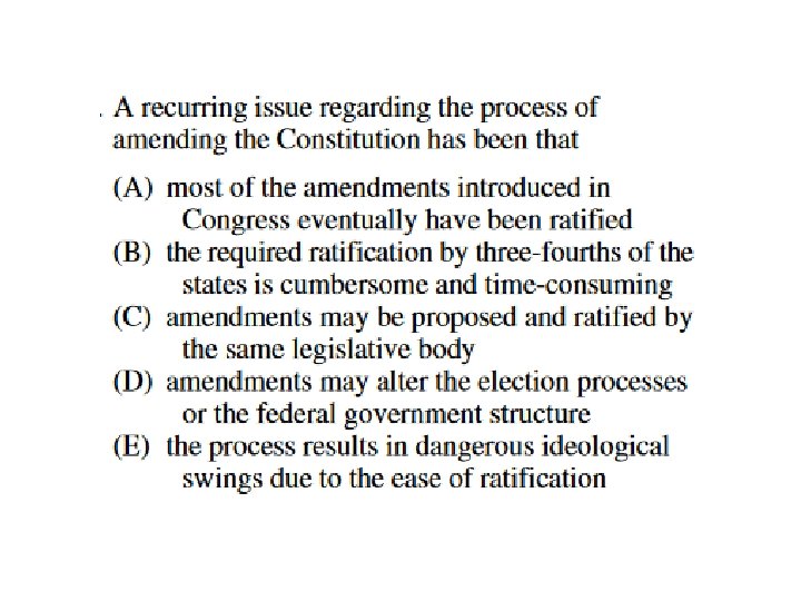 Changing the Constitution formally, i. e. adding Amendments. A. Legacy of Articles: Unanimous vote to amend ----> impractical ---> desire to make process easier, but not too easy. B. Reasons for recent popularity of proposing Amendments (e. g. , balanced budget, D. C. statehood, ERA). 1. Dissatisfaction by interest groups with court decisions, e. g. , flag burning decision 2. Gridlock in Congress.