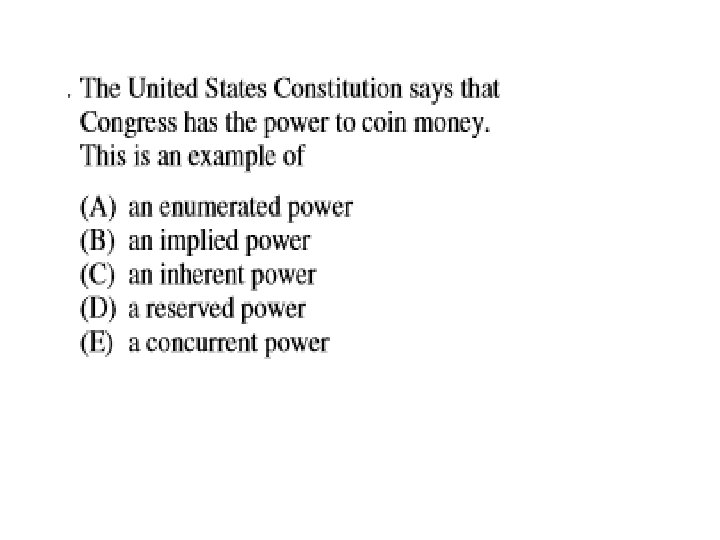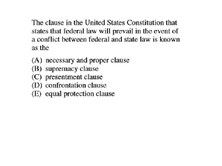 IV. Sources of National Strength. A. Elastic clause: Congress can pass laws “necessary and proper” to carry out expressed powers. B. War powers. C. Commerce clause: virtually anything is interstate or foreign commerce Congress can regulate virtually anything. D. Power to tax and spend for the “common defense and the general welfare. ” 1. While Congress cannot technically legislate on everything, it can spend funds on virtually everything. 2. States don't have to accept federal money, but if they do, they must follow federal guidelines (e. g. , fed. highway funds can be denied if a state’s alcohol purchasing age is less than 21, fed. education funds can be denied if states do not comply w/No Child Left Behind Act) -- Federal "strings" attached to funding are ways in which the federal govt. can get its way on things. E. Preemption of state laws by fed. courts if laws in conflict w/Const. or fed. laws. F. Imposition of federal mandates (some unfunded) on states
