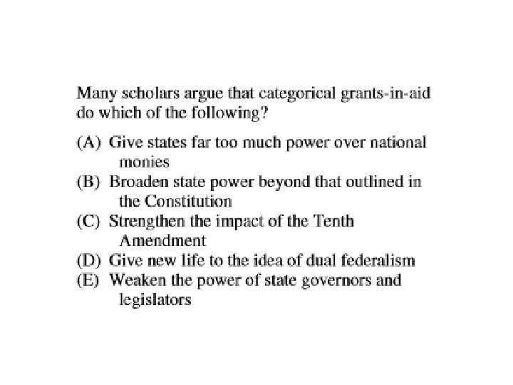 Types of Fed. Grants A. Categorical. 1. For specific programs (e. g. , roads, airports, housing, bilingual education). 2. National govt. agrees to pay a portion of the costs for these, and states pick up the balance --> these sometimes called "formula grants" because grants are offered under a payment formula (e. g. , 80%-20%). 3. States don't have to accept these, but if they do they must comply w/fed. standards.