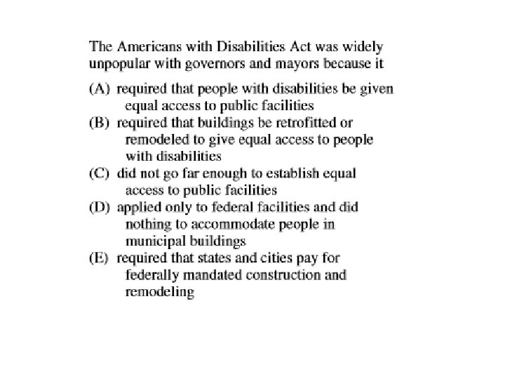 FEDERAL MANDATES • • • Mandate: a federal order imposed upon states. Examples: Americans with Disabilities Act. Various environmental acts, e. g. , Clean Air Act, Clean Water Act Individuals with Disabilities Education Act